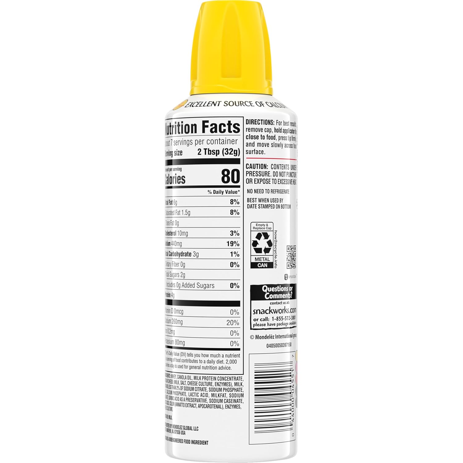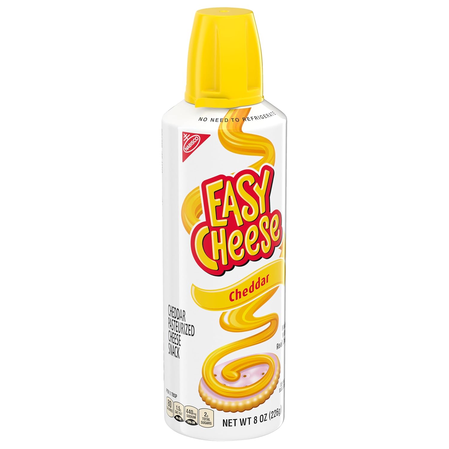 EASY CHEESE Cheddar Cheese Snack has the delicious taste of cheddar cheese in a fun, spreadable form. This spray cheese is pasteurized and requires no refrigeration, making it a convenient, go anywhere snack. Made from milk, whey, and real cheese culture, EASY CHEESE spread is an excellent source of calcium. Use EASY CHEESE cheese snack to create designs on crackers or pretzels to make snacking more fun, top tortilla chips with this spray cheese for instant nachos or add some cheesiness to your meals. This bulk box of EASY CHEESE comes with 12 individual 8 ounce cheese cans that store easily in pantries.