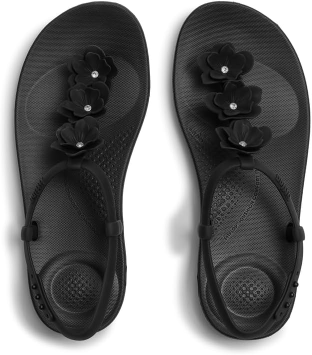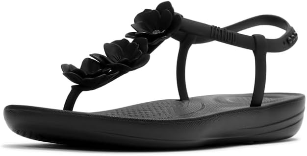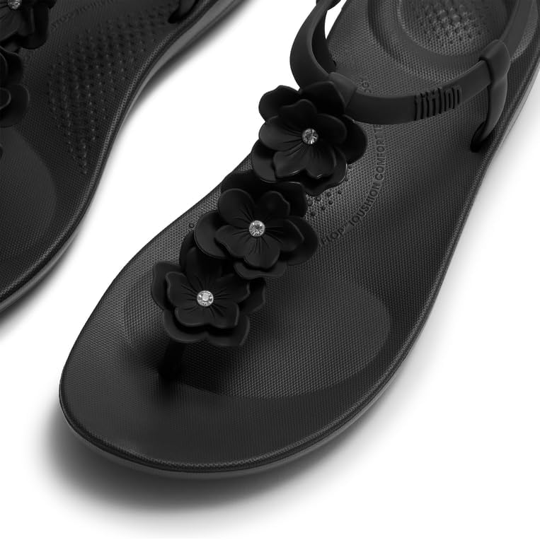 FitFlop best-selling beach flip-flops are back – now adorned with blooming florals. They’re set on the brand's ultra-lightweight, high-rebound iQushion™ midsole, biomechanist-developed to maximize comfort and support while keeping a light, flat sole. Up top, that staple, minimalist T-bar strap is crafted from rubber that’s fully waterproof – including the intricately crafted flowers. Adjust the fit by popping the strap into one of the three nodules at the side. Perfect for days spent cooling your toes in the ocean or nipping down to the pool. Ergonomically engineered to help optimize your body’s alignment, natural movement & energyUltra-light iQushion™ midsole, made of high-rebound air-foam that retains its cushioning, with front-and-back impact pillowsAnatomically contoured footbed diffuses pressure & gives natural arch supportGrip suited to everyday use/road treadWaterproofUpdated fastening for more adjustability & securityStandard width fit, this style fits true to size