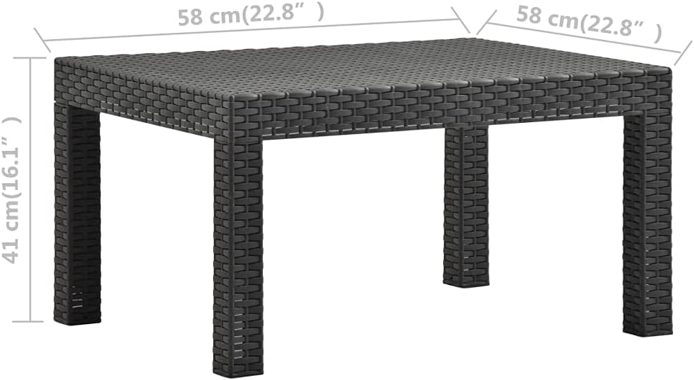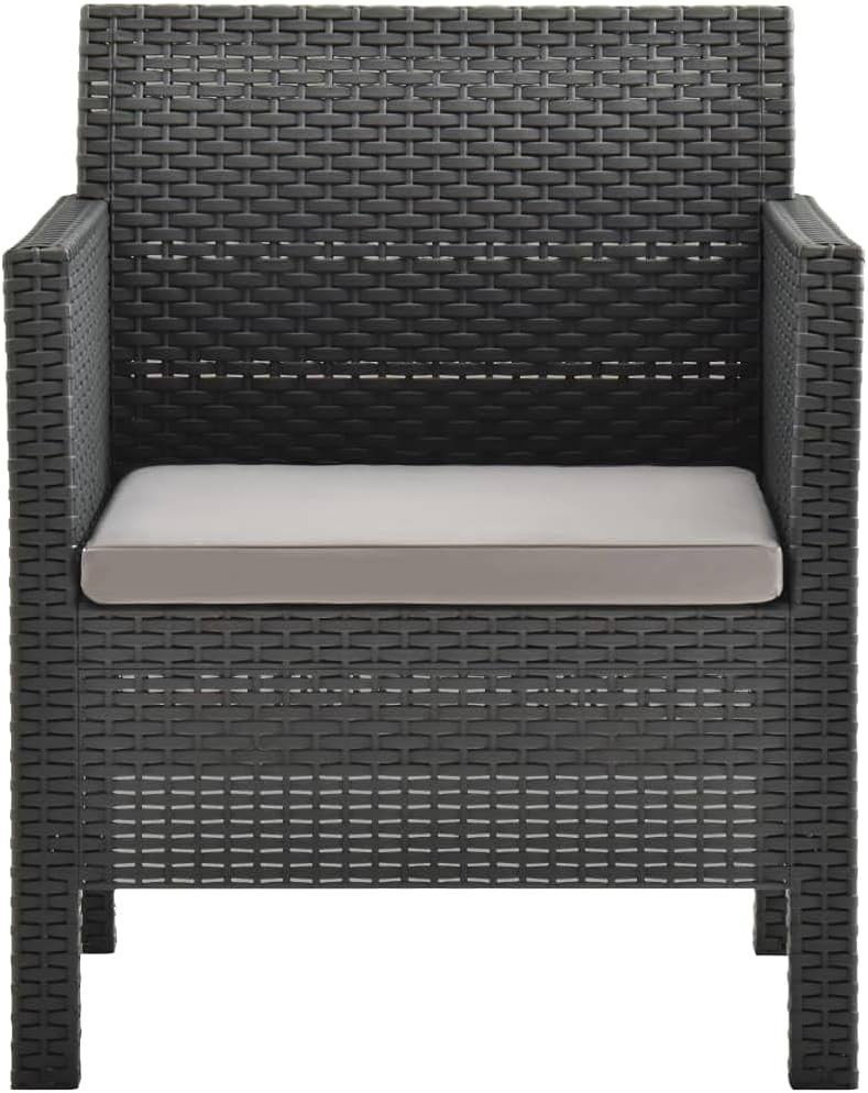 Enjoy your outdoor relaxation time with this patio lounge set.This outdoor furniture set has a lightweight construction of polypropylene, making it easy to clean and suitable for outdoor use. The included UV-resistant cushion, ergonomic backrest and rounded armrest provide additional seating comfort for the patio chair. The cushion cover can be removed and washed.This lounge set is easy to move around to suit any setting. You can combine them with other outdoor furniture as per your taste.Color: AnthraciteMaterial: PP (Polypropylene) with rattan lookTable dimensions: 22.8" x 22.8" x 16.1" (W x D x H)Chair dimensions: 24.8" x 25.6" x 29.9" (W x D x H)Seat width: 20.1"Seat depth: 20.5"Armrest height from the ground: 24"Seat height from the ground: 14.2"Cushion thickness: 2"UV resistantAssembly required: YesDelivery contains:1 x Table1 x Chair1 x Seat cushion