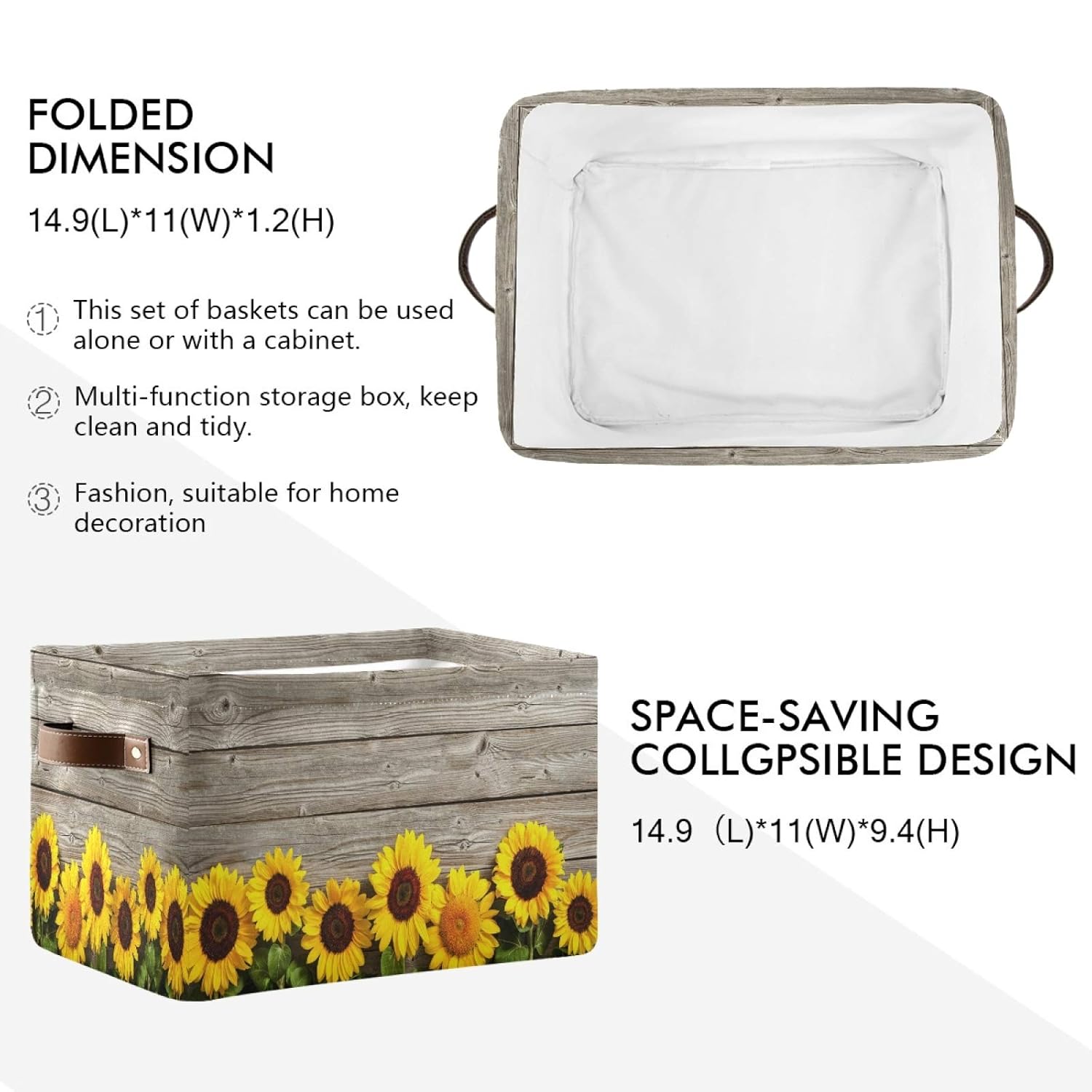 Size: 15 (L) × 11 (W) × 9.5 (H) Weight: 13.1OZ Why choose STAYTOP storage basket? STAYTOP uses a unique DIY pattern to design beautiful and interesting, the storage box is a beautiful landscape at home The leather-fastened handle design makes it easier for you to carry goods. Each handle is reinforced so that you don’t have to worry about breaking it. Compact, foldable design allows you to store it when not in use, saving space and easy to carry The STAYTOP Shelf basket is made of highly durable materials, which is not only lightweight but also has a long service life! Solve the trouble of messy family things for you If you are troubled with messy things in your home and you can see clothes and toys everywhere, then you need a beautiful and large-capacity storage box to store things neatly in one place. Whether you need to pack clothes, organize clothes and laundry, or pack toys, having a spacious laundry basket is no longer a tedious thing. Washing tips -Only wipe clean, do not use abrasive cleaners. -Do not use the washing machine to clean the bag, otherwise it will damage the waterproof coating. skills The basket set comes with compressed packaging, which may cause wrinkling and wrinkling during long-distance transportation. It will gradually recover after a while, or it can be smoothed out with a steam iron and hair dryer.