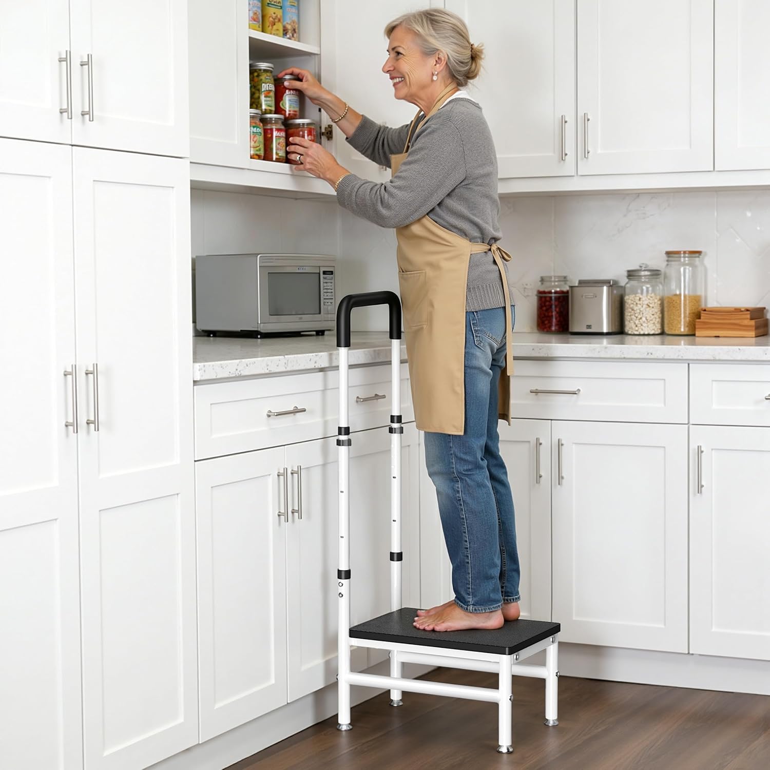 This sturdy step stool combines heavy duty steel construction with a non-slip wooden platform and adjustable handrail for safe stepping. Perfect for bedside, bathroom, and home use, it supports up to 400 lbs and adapts to uneven floors. Easy to assemble, durable, and reliable for daily use.