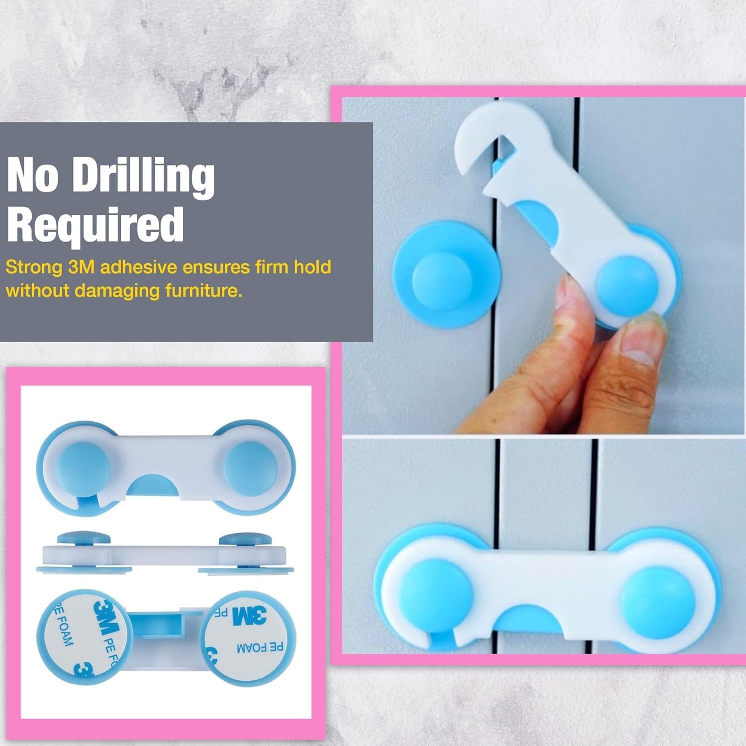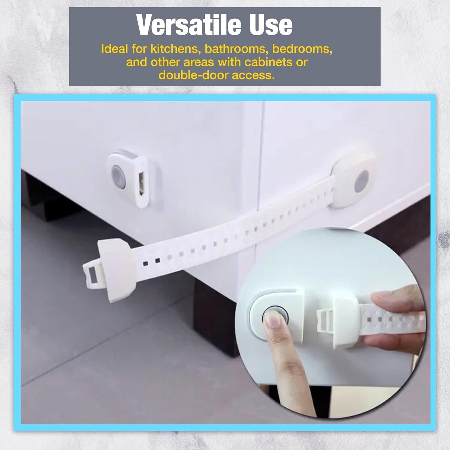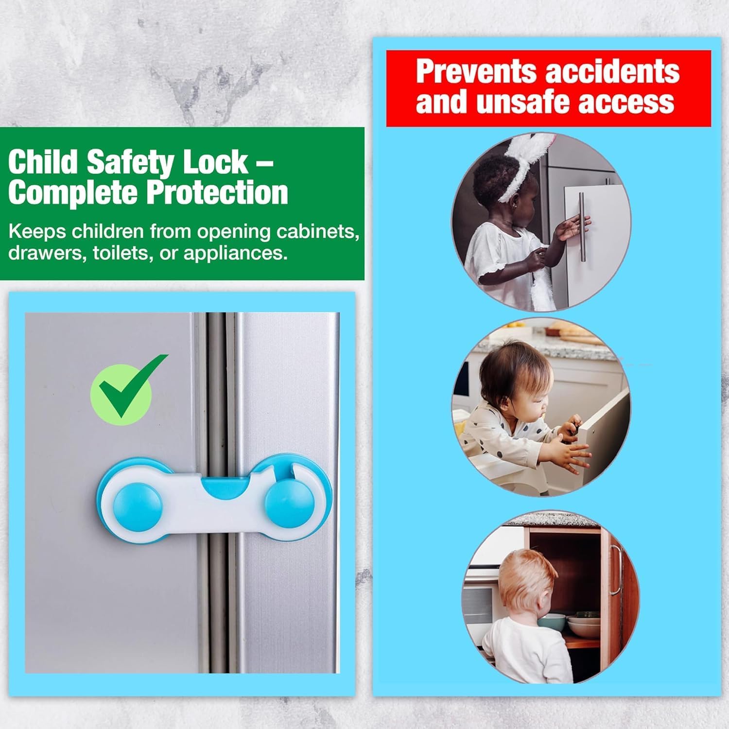 Protect your little ones from accessing unsafe cabinets and drawers with this 5-Piece Child Safety Lock Combo. The set includes 4 Cabinet/Drawer Locks and 1 Multi-Purpose Lock, designed to secure cupboards, drawers, wardrobes, refrigerators, and appliances. Made from durable, non-toxic, child-safe material, these locks help prevent accidental access to sharp objects, medicines, cleaning supplies, and other household hazards. The strong adhesive backing ensures firm installation without drilling or damaging furniture. Easy for adults to open, yet difficult for children to unlock — making it an essential baby-proofing solution for every home.