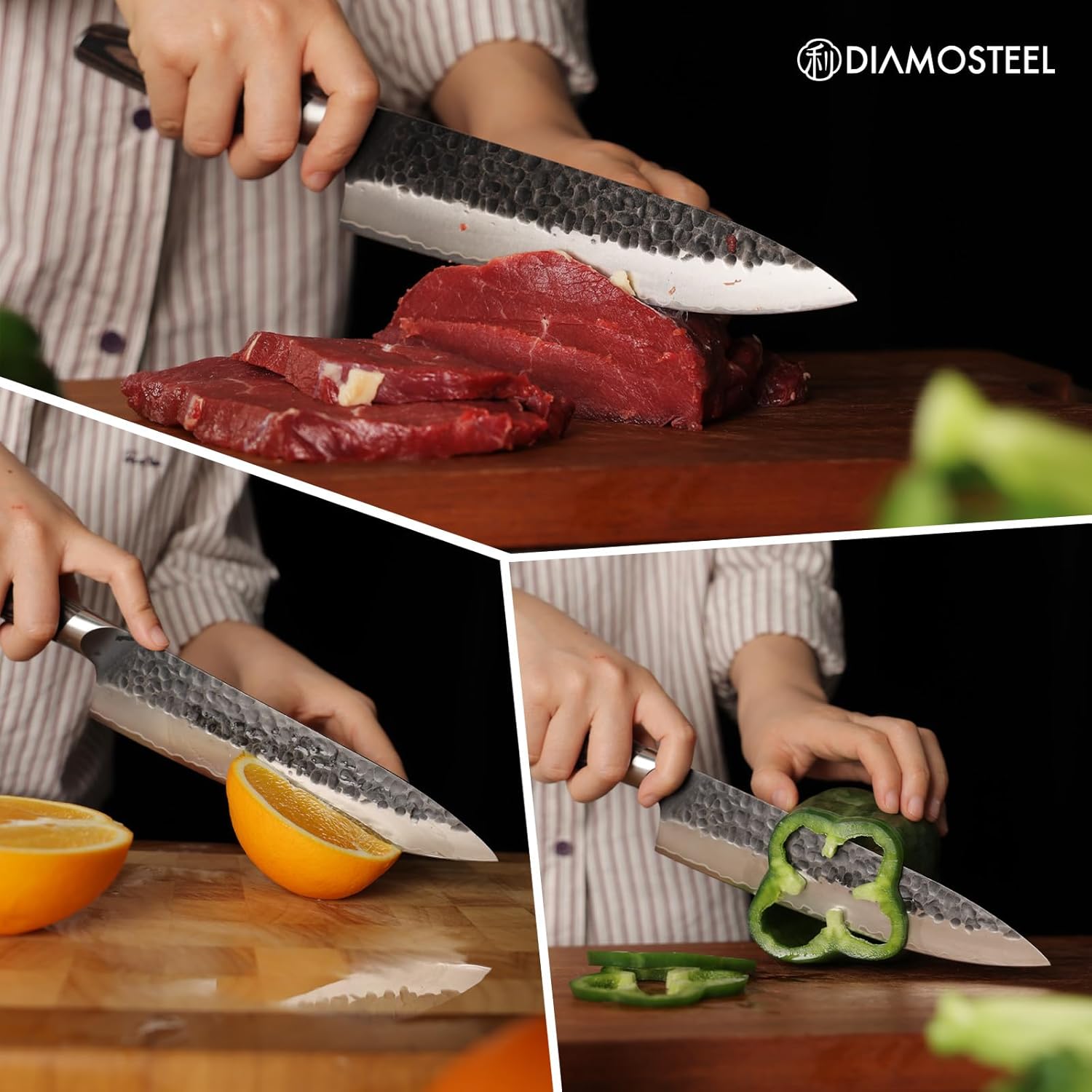 • PREMIUM TRIPLE-LAYER STEEL BLADE : Say goodbye to dull kitchen knives. Our Diamosteel chef knife is crafted from high-quality 9CR18MOV three-layer composite steel, boasting a sharp edge honed to 12-15° and a hardness rating of HRC58-60. This ensures superior edge retention and rust resistance, making it your dependable cooking knife for years of precise slicing and dicing.