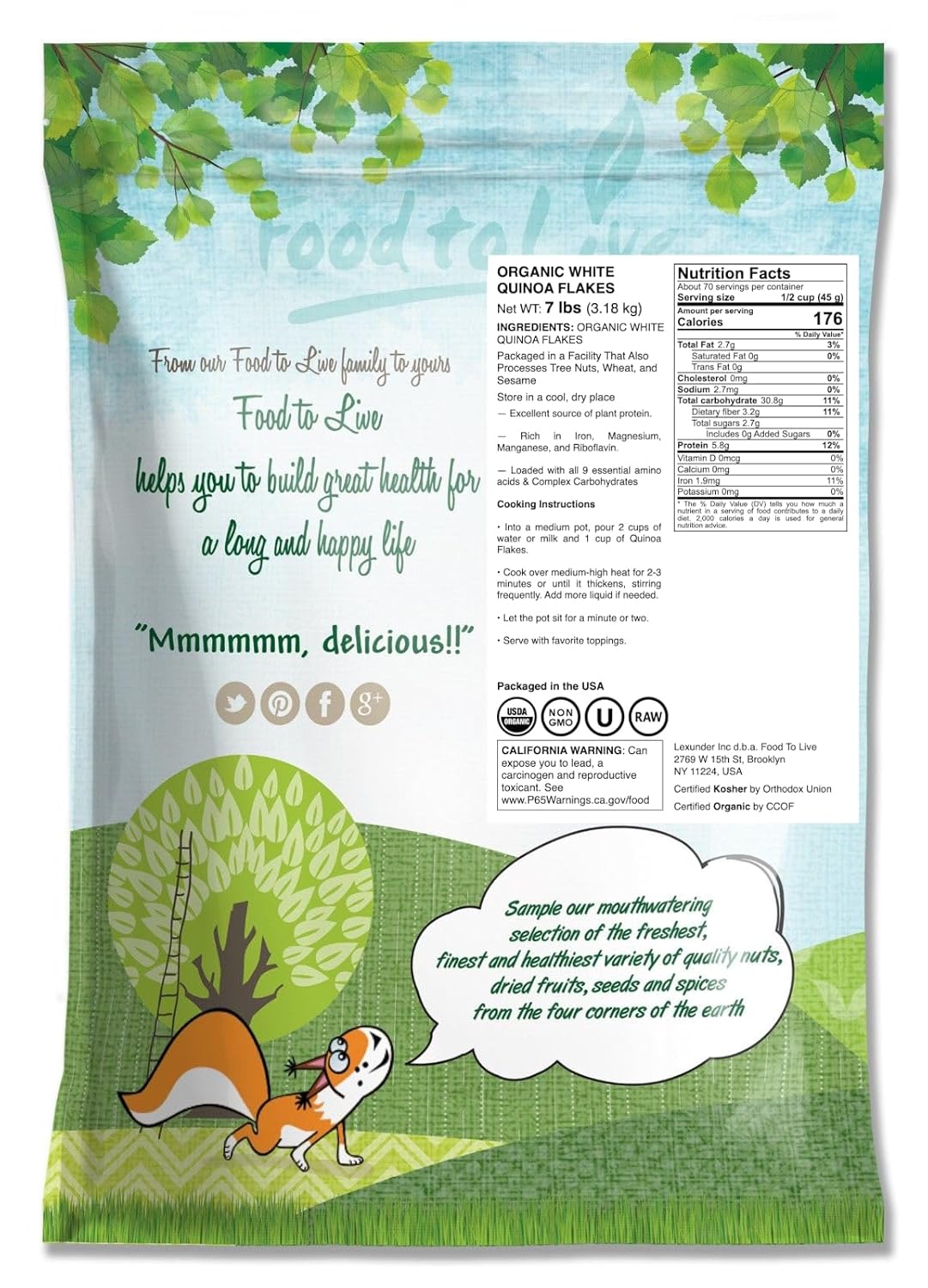 — Non-GMO, Kosher, Vegan — Dietary Fiber and Protein Source — Contains Iron Organic White Quinoa Flakes: A Better Way to Eat Quinoa If you want to enjoy quinoa’s nutrient benefits in a form that’s more convenient to eat, Organic White Quinoa Flakes are what you need. They contain all the same nutrients since they come from pressed grains. However, the flakes take less than two minutes to cook, and they can add texture to a variety of dishes and baked goods. Organic Quinoa Flakes retain all the nutrients of this pseudo-grain. They are rich in fiber and contain complete proteins. It is rare in plant foods as most of them only provide some of the amino acids that your body needs. However, Organic Rolled Quinoa Flakes give you complete proteins, good fats, and even essential minerals. Quinoa is particularly rich in iron. Why You Should Buy Organic White Quinoa Flakes in Bulk The best thing about Organic Flaked Quinoa is that it’s elementary to use in many dishes. You can soak the flakes overnight with milk or yogurt to enjoy a delicious breakfast. Note that Organic Quinoa Flakes taste like quinoa. Therefore, it’s best to flavor them with fruits, yogurt, or chocolate. You don’t have to cook Organic Rolled Quinoa Flakes at all. They can be eaten raw when soaked with milk, yogurt, or something else. If you want to enjoy some hot white quinoa flakes porridge, you only need to cook it for 90 seconds. You can also use Organic White Quinoa Flakes to make no-bake cookies or add them to pancakes. You can also use them for texture and added protein in brownies, muffins, and other baked goods. Another idea is to use Organic White Quinoa Flakes as a thickener in stews or as a breadcrumb substitute when breading meat. Cooking Instructions Bring water or milk to a rapid boil. Add the quinoa flakes. Let the pot sit for a minute or two. Stir well, and you’re ready to go._Nutrition Facts 1 servings per container Serving size1 oz (28 g) Amount Per Serving Calories109 % Daily Value* Total Fat 2g 2% Saturated Fat 0g 0% Trans Fat 0g Cholesterol 0mg 0% Sodium 2mg 0% Total carbohydrate 19g 7% Dietary fiber 2g 7% Total sugars 2g Includes 0g Added Sugars 0% Protein 4g 7% Vitamin D 0mcg 0% Сalcium 0mg 0% Iron 1mg 7% Potassium 0.01mg 0% Riboflavin 1mg 55% Phosphorus 150mg 12% * The % Daily Value (DV) tells you how much a nutrient in a serving of food contributes to a daily diet. 2,000 calories a day is used for general nutrition advice. Ingredients: ORGANIC WHITE QUINOA FLAKES Storage Time: Up to 1.5 years Country of Origin: Peru Packaged in: the USA Store in: Cool, Dry Place Allergy Info: Packaged in a Facility That Also Processes Tree Nuts, Wheat, and Sesame Kosher Non-GMO Organic Vegan