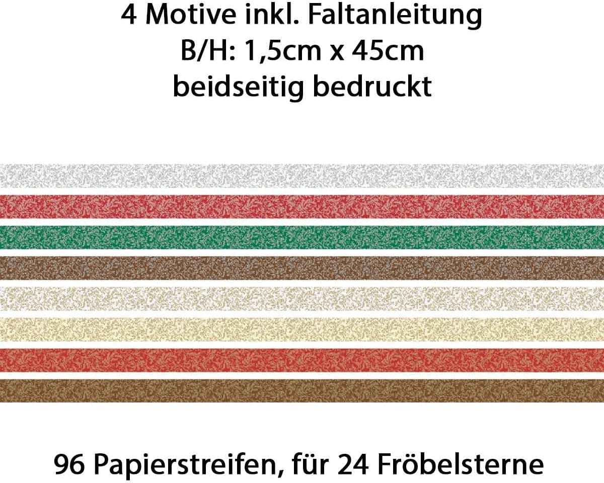 With this high-quality folding strip set, you can make 24 beautiful Froebel stars in no time at all - perfect for the Advent season, festive decoration or creative DIY projects. The 96 double-sided printed paper strips in elegant natural and gold tones give any star an elegant look - either with pearl effect or high-gloss finish. IDEAL FOR BEGINNERS AND ADVANCED - Easy to follow folding instructions are included in the set. The folding strips are made of sturdy 120 g/m² creative paper with a size of 1.5 x 45 cm - perfectly matched for Froebel stars with a diameter of approx. 7 cm. The paper can be folded precisely and impresses with its high-quality workmanship. Whether as a festive Christmas decoration, lovingly made gift or as a creative craft idea for young and old - this set is a must for anyone who loves crafts, origami and stylish DIY projects.