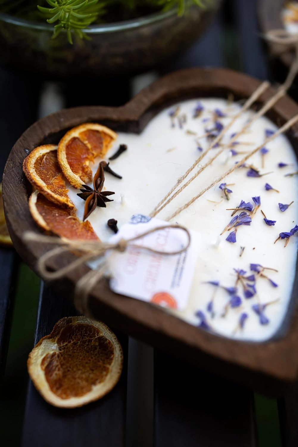 What a Beautiful Heart Shape Love dough bowl candle , is such a great addition to any home decor , farmhouse , farmhouse decor. A nice touch for mother's day , a gift for you mom. Using 3 Wooden wicks here , if you prefer cotton wick just reach out we are happy to change it for you .And not to mention smells heavenly . Size: Aprox W 7 in H 1.80in Please note: as the dough bowls are hand - carved and sourced from a local seller, the shape, color and sizes may vary. Please never leave a burning candle unattended. Please note if you decide to burn this candle , since everything is dry and real and this is wood , if you don't remove the decor on top or you don't move it around they can get of fire. So Please make sure you use your own safety and cation on your own risk. Please note this listing is for one Candle only. Each candle is hand poured with vegan natural non GMO pet friendly soy wax. Your bowl is also reusable , after your wax is burned just clean it and you can use it as decoration or storage etc. If your shopping as gift pls note there is Cards available You can just write your text and your name and we can made it for you , they come in white , light pink , light brown color with some black text , we can also customized by your wishes. Each candle is poured in small batches. Every single candle is unique and colors may vary.