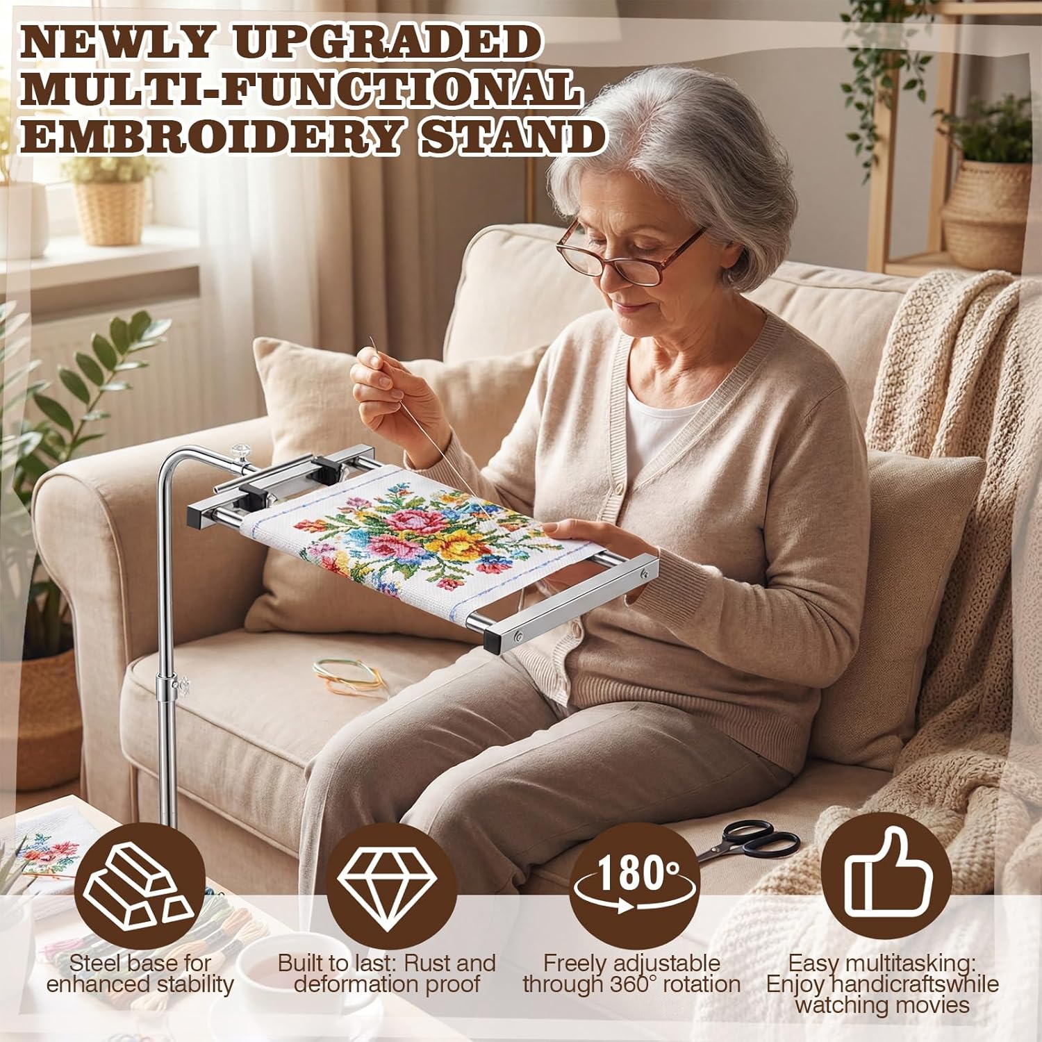 • Durable and Long-lasting: the base of this embroidery hoop frame is made of coated steel, offering structural strength, scratch resistance, and long-lasting durability; Unlike wooden frames that may loosen or warp over time, this metal frame remains sturdy even under heavy use and frequent operation; Its weighted base enhances stability, keeping large frames firmly