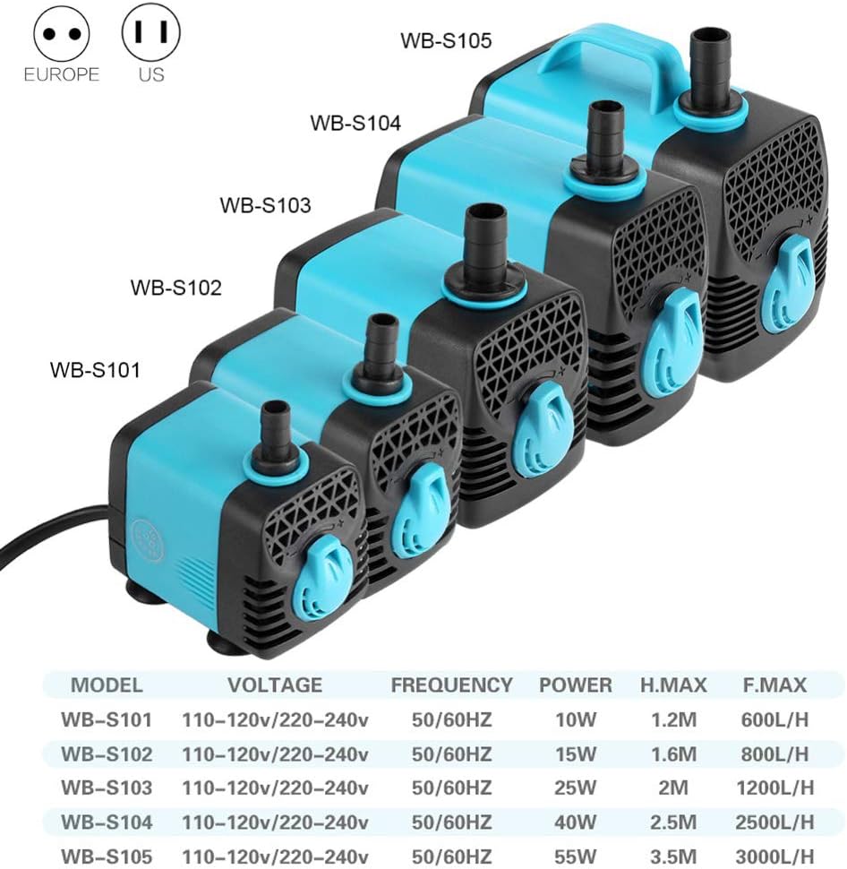 Package included:1 x Submersible Water pump1 x Power adapter(Also come with a plug adapter according to your country)Type: (optional)ModelVoltageFrequencyPowerH.MAXF.MAXSizeWB-S101220-240V50HZ10W1.2M600L/H73*44*53MMWB-S102220-240V50HZ15W1.6M800L/H84*53*66MMWB-S103220-240V50HZ25W2M1200L/H99*59*70MMWB-S104220-240V50HZ40W2.5M2500L/H125*95*99MMWB-S105220-240V50HZ55W3.5M3000L/H149*80*105MM.